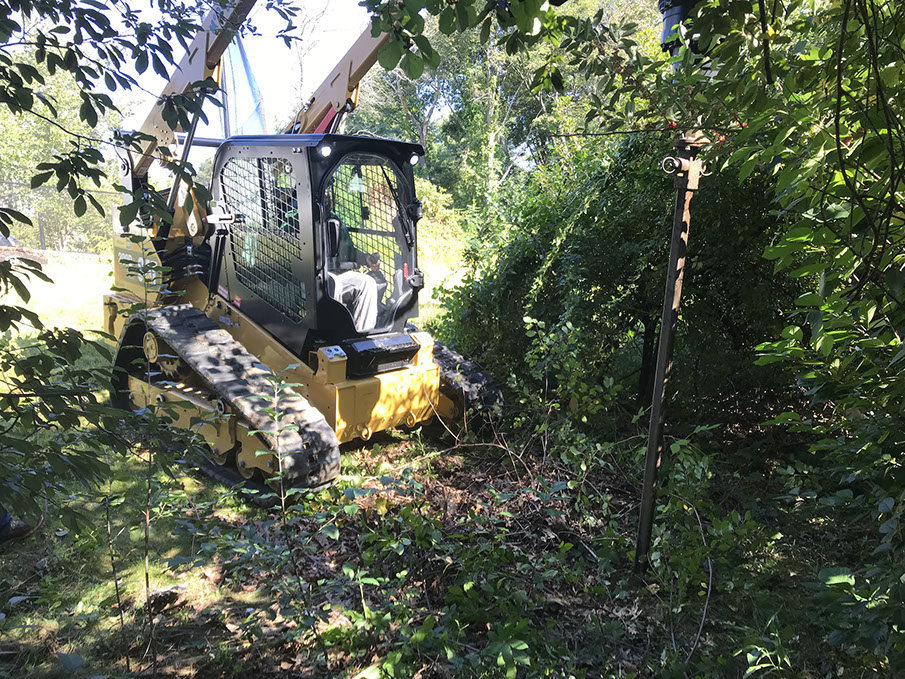 Installing earth anchors in the woods for a pole-line. Only reachable with our outfitted skid steer.