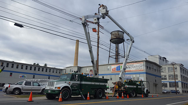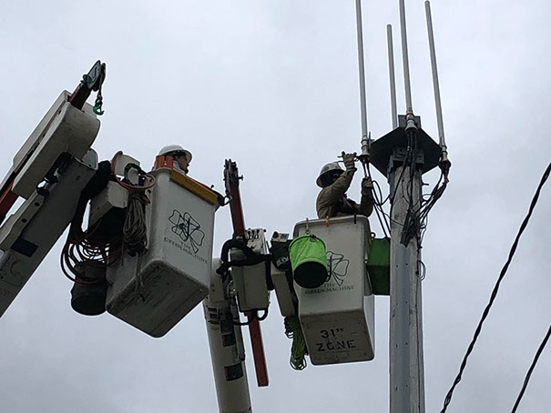 Our workers are certified Union trained linemen from IBEW Local #104 and have the necessary skills and jurisdiction to work in and above the secondary power space, in contrast to electricians or communication workers who are restricted by the power utility to work in the pole space below secondaries (roughly 20-25 feet).