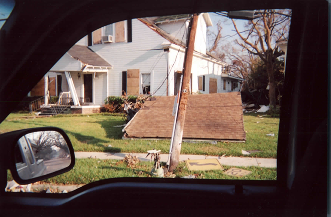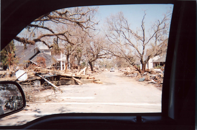 Hurricane Katrina 2005, devastating wind damage to buildings.