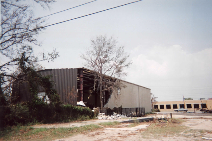 Hurricane Katrina 2005, devastating wind damage to buildings.